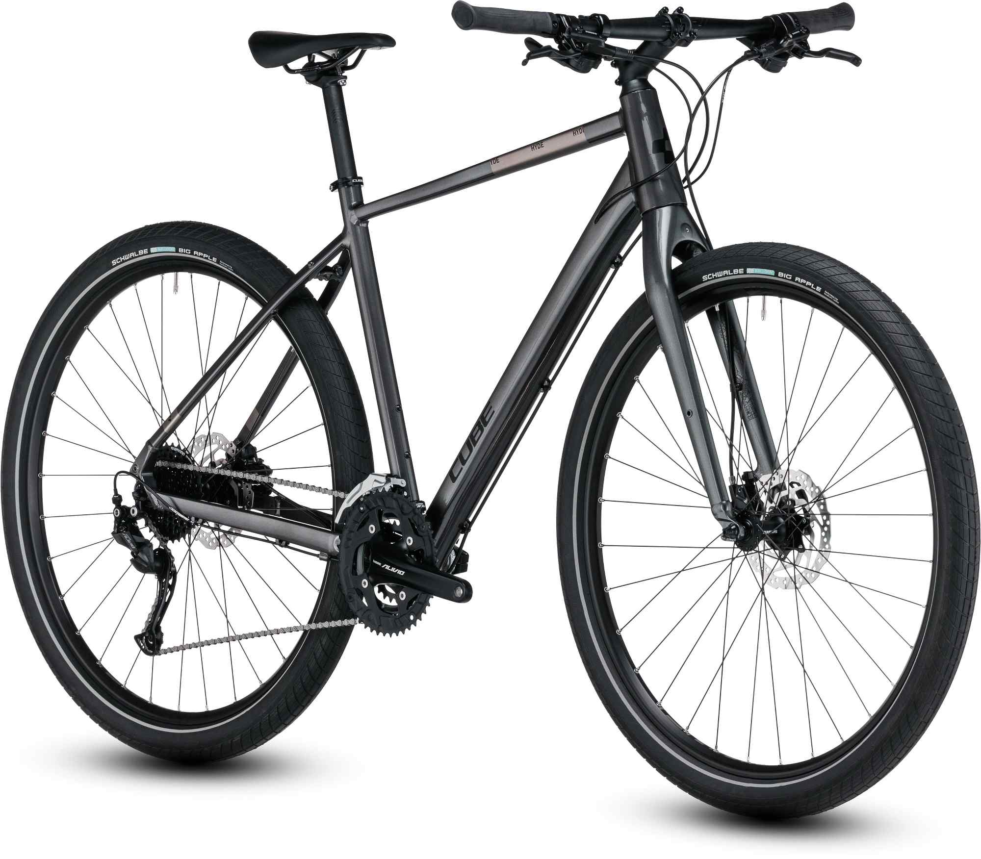 Met de CUBE Hyde zijn we terug gegaan naar de basis. Deze minimalistische stadsflitser brengt je op de snelst mogelijk manier van A naar B. Z’n strak gelijnde aluminium frame is gemaakt van dezelfde double-butted buizen als onze mountainbikes: licht, stijf en sterk. En ook de voor mountainbikes zo karakteristieke volumineuze banden - in dit geval zonder noppen - komen in de stad tot hun recht. Files, stoplichten, tramrails en stoepranden: de Hyde lacht erom. En moet je onverwacht uitwijken, dan gaat dat vanwege de intuïtieve besturing en de lichte aluminium voorvork haast vanzelf. Ook op de hydraulische schijfremmen kun je altijd rekenen, ook als je door een buitje overvallen wordt. In zulke omstandigheden spelen de banden nóg een troef uit: sublieme grip. Welkom in de stadsjungle.