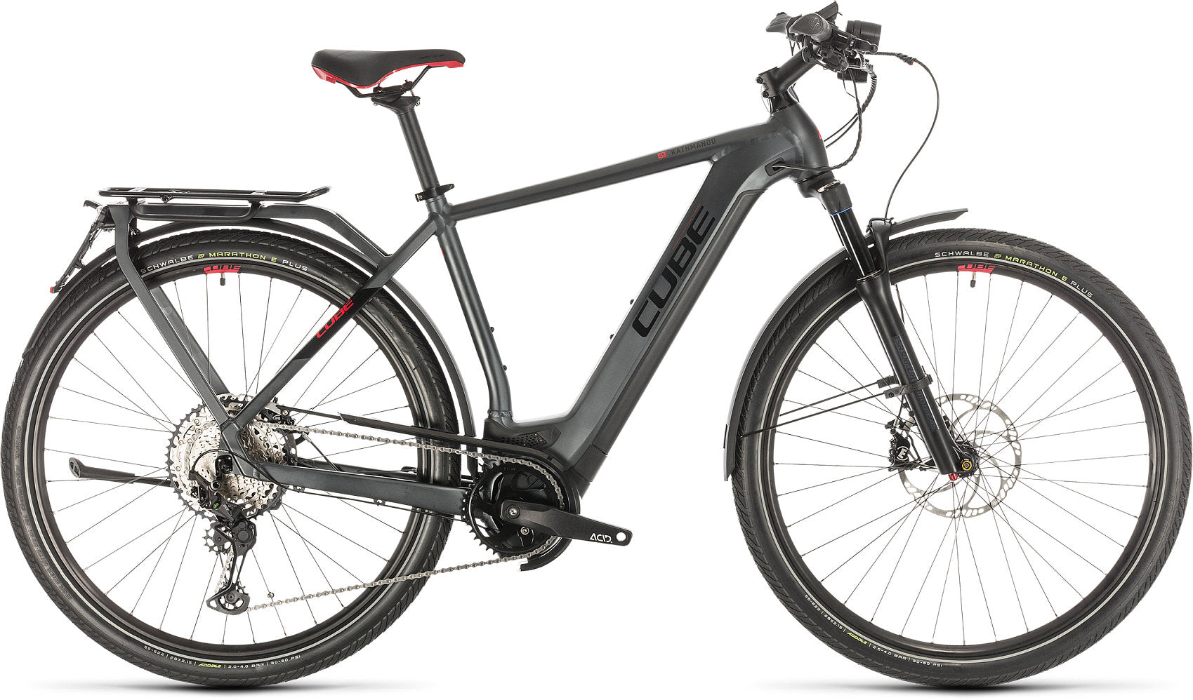 Met de nieuwe speed pedelec zijn veiligheid, tractie en comfort gegarandeerd, ook vanwege de 55mm brede Schwalbe Marathon E-Plus banden. De CUBE Kathmandu Hybrid 45 625 wordt afgerond met krachtige schijfremmen met extra grote remschijven, lange spatborden, een stevige achterstandaard en geïntegreerde verlichting (inclusief remlicht).