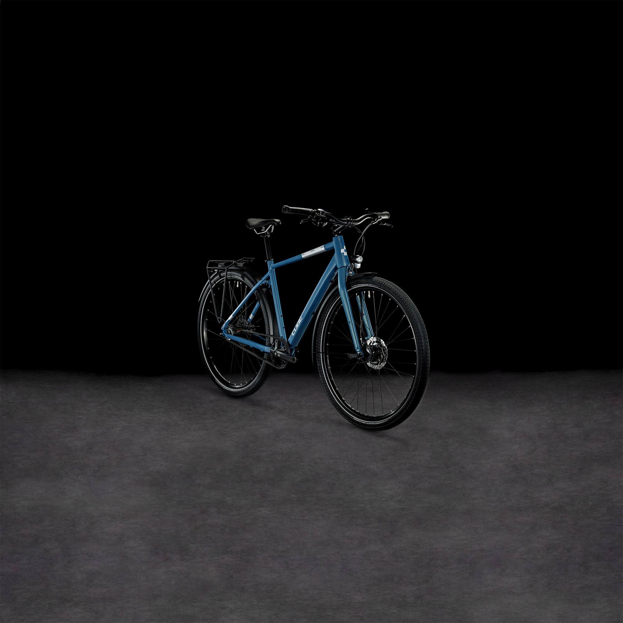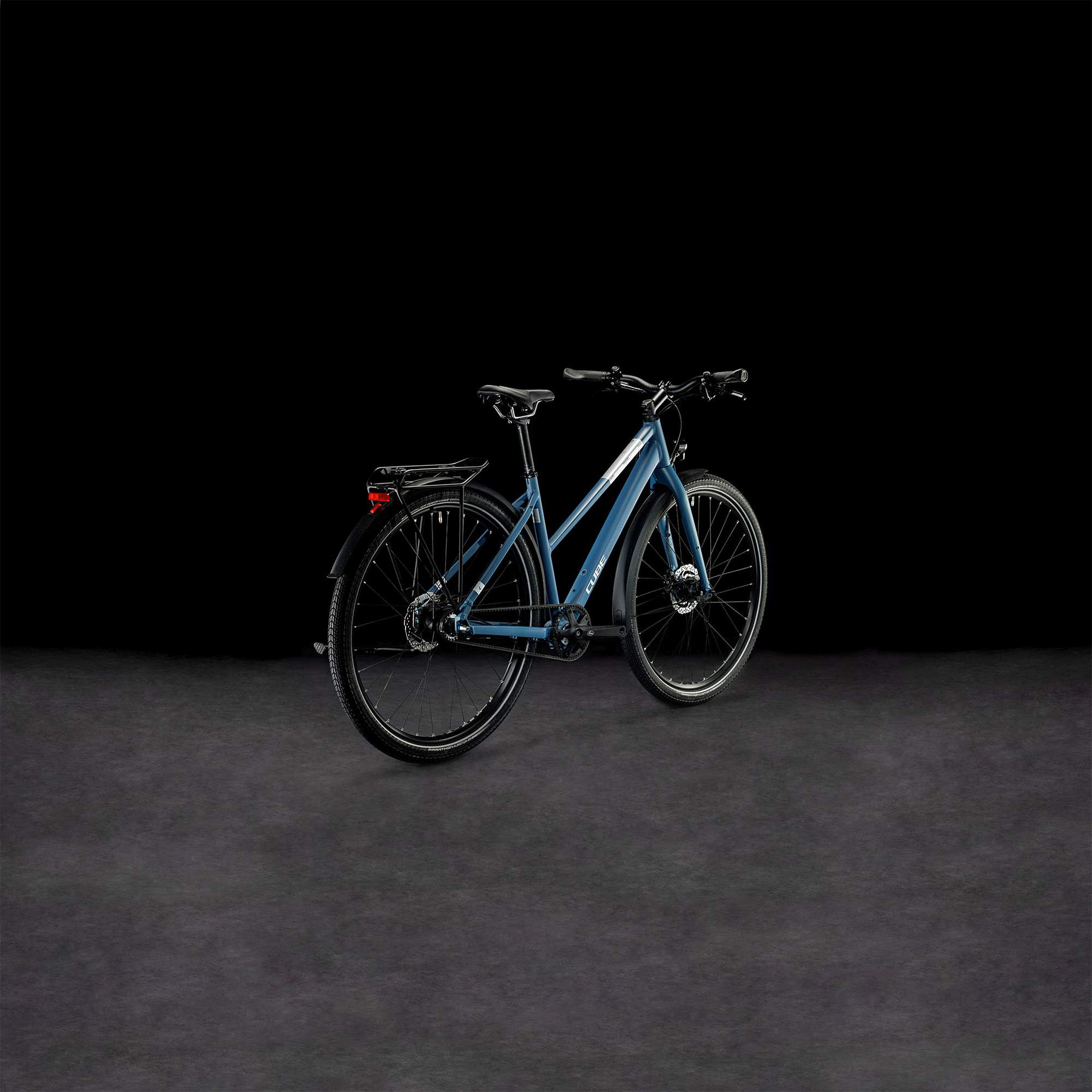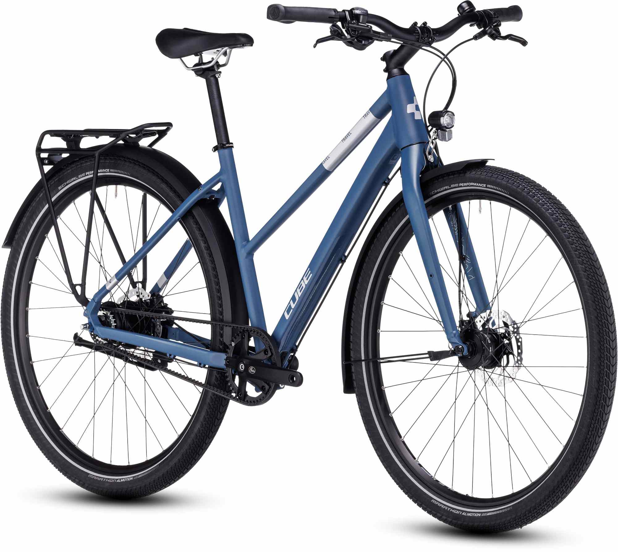 De ingetogen ogende CUBE Travel Pro is een fiets die je snel onderschat. Maar laat je niet foppen! Z’n frame is gemaakt van dezelfde hoogwaardige materialen als onze mountainbikes. Want waarom zou je een reisfiets niet net zo efficiënt en stabiel maken? Aan de speciale achterpatten hebben we een stevige drager plus een achterstandaard gemonteerd; ideaal als je met tassen onderweg bent. De aluminium voorvork biedt desgewenst plek aan een lowrider. In het voorwiel is een naafdynamo ondergebracht en in de achternaaf zitten acht versnellingen verstopt, volledig ongevoelig voor het weer. Dat geldt ook voor de aandrijfriem. Die gaat langer mee dan een ketting en is daarbij ook nog eens schoon en stil. Ook de schijfremmen zijn weersongevoelig. Eveneens fijn: de volumineuze banden, die meer comfort, grip en tractie bieden. En het mooiste is: op grind- en boswegen rollen ze nog lichter ook!